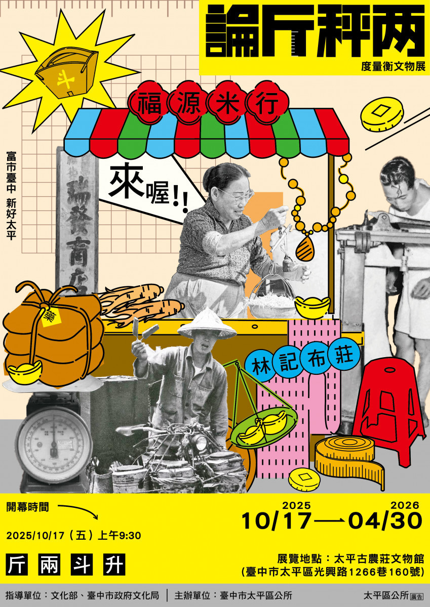 現代人準備年菜時,已有各色各樣的現成菜餚能選擇、預訂,洗手作羹湯的機會比起過去少了許多,但過年期間免不了還是要論斤秤兩─無論是秤菜,還是秤自己的體重。太平古農莊文物館在這段期間,推出了「論斤秤兩」展覽,讓觀眾親自體驗「一桿秤仔」如何量測蔬菜重量、量體裁衣應該怎麼使用布尺,而站上巨大的「磅秤」則是最受大小朋友歡迎的體驗,快點呼朋引伴來看看彼此幾兩重!