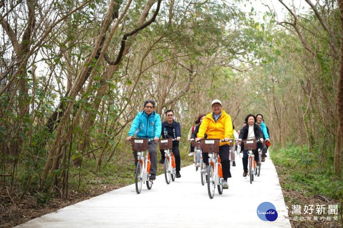 縣長楊文科(中黃衣)與多名議員一同體驗自行車道的魅力。