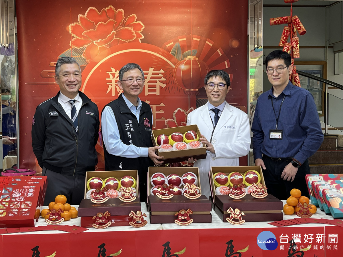 馬年前夕,桃園市副市長王明鉅、衛生局副局長藍章杰及醫事科秘書林香瑩14日特地前往衛生福利部桃園療養院,致贈象徵新春祝福的水果禮盒、福袋及春聯,慰勞春節期間仍堅守崗位的第一線醫護同仁。桃園療養院院長廖定烈則回贈樂桃桃庇護工場烘焙禮盒,感謝市府長官於歲末年初前來關懷,讓醫護同仁在迎接馬年之際感受到支持與溫暖。