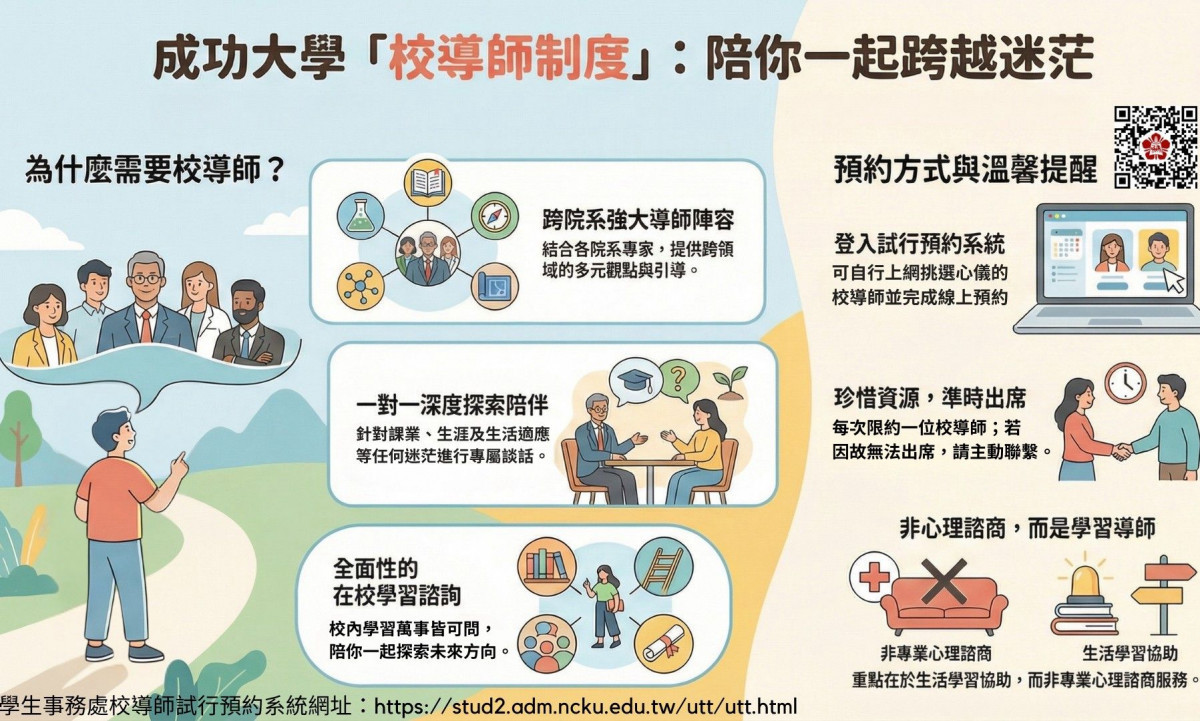 國立成功大學學生事務處推出「校導師」試行制度。這項制度打破傳統系所限制,集結校內跨院系的強大導師陣容,提供學生一對一的深度探索陪伴。無論是課業壓力、生涯規劃還是生活適應上的迷茫,學生皆可透過專屬談話,與校導師一同探索未來的無限可能。
