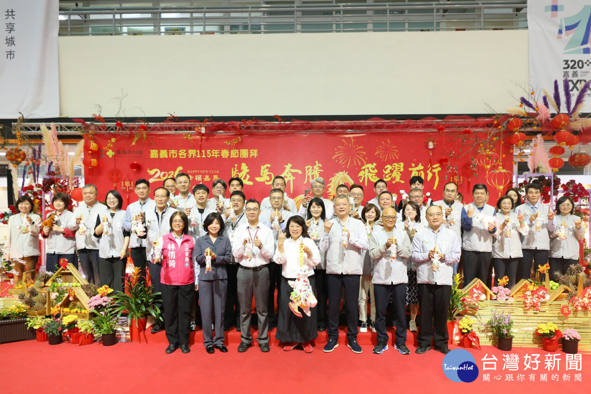 嘉義市政府與財政部南區國稅局嘉義市分局,今(23)日在市府1樓中庭廣場共同舉辦115年春節團拜活動,市長黃敏惠除與各界互道新年恭喜,也再次呼籲中央應正視地方發展的需求,全額負擔鐵路高架化建設,並加速推動高鐵聯外輕軌。