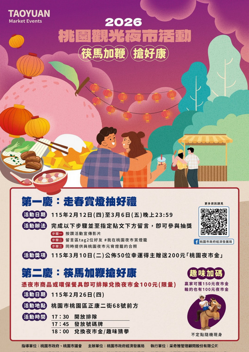 為增添節慶趣味,活動現場另安排趣味加碼活動與神祕NPC猜拳互動,民眾不論輸贏皆有機會獲得好康。此外,同步推出線上「走春賞燈抽好禮」活動,民眾於3月6日(五)前,只要到桃園觀光夜市與元宵燈籠合影,並至「桃園市政府經濟發展局」臉書粉絲專頁完成指定任務,即有機會抽中限量200元桃園夜市金。
