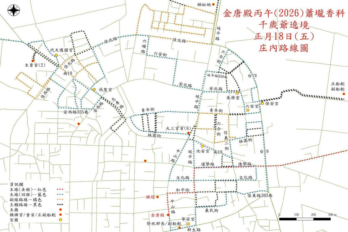 佳里區金唐殿香科醮典俗稱蕭壠香,為台南市定民俗活動、名列南瀛五大香。2026年丙午年香科將於3月6日至8日,舉辦千歲爺及百足真人蜈蚣陣遶境活動。佳里警察分局表示,為維護活動安全及道路交通順暢,將依香陣行經過程和路線實施交通管制,建議用路人避開遶境路線,盡量改行替代道路。