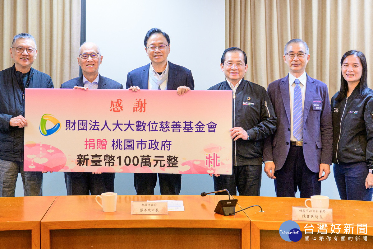 「財團法人大大數位慈善基金會捐贈儀式」5日下午於桃園市政府1602會議室舉行,市長張善政與會表示,誠摯感謝大大數位慈善基金會長期深耕桃園、關懷弱勢兒少,今(115)年更將捐助金額擴大至120萬元。這筆善款將精準投入社會局家防中心與警察局少輔會,提供不幸環境中的青少年在人格發展的關鍵階段,能得到更多支持資源,協助其回歸生活正軌。市府也將妥善運用捐助資源支持第一線社工,發揮愛心最大效益,透過公私協力完善社會安全網。