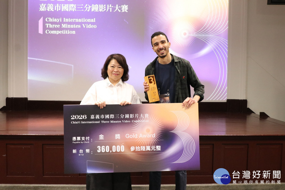 第七屆「嘉義市國際三分鐘影片大賽」今(6)日於嘉義市立美術館舉行得獎名單公布暨頒獎典禮。今年共吸引33國投稿,作品達193件,歷經專業評審團嚴謹評選,最終遴選出10件最優秀作品。嘉義市長黃敏惠授獎予本次得金獎的法國導演索菲安·舒艾卜 Sofian Chouaib,並頒發獎金36萬元,以嘉勉其對影像藝術的貢獻。