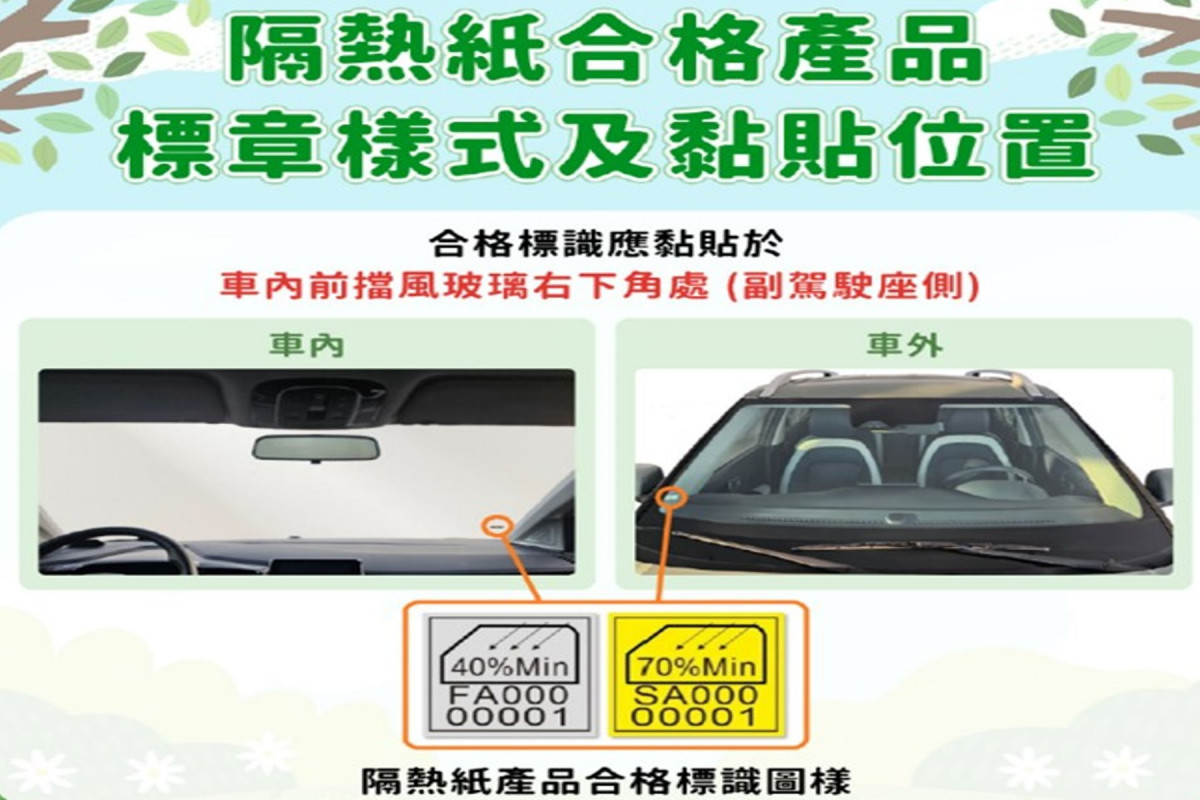 新營監理站表示,隔熱紙合格標識有2種方式,一種是業者直接將合格標識烙印於產品上,另一種由車輛安全審驗中心印製、核發。再由業者烙印的合格標識,標識內容至少應包含廠牌、型號及可見光透過率,每面玻璃留有1個合格標識浮水印,且不限張貼位置。由車安中心核發的合格標識,應黏貼於車內前擋風玻璃右下角處,黏貼張數以1廠牌、1型號、黏貼1張為原則。