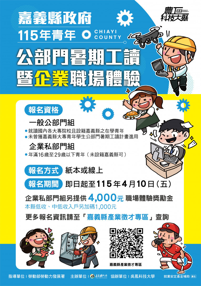 嘉義縣政府推出「青年公部門暑期工讀暨企業職場體驗」活動,即日起開放報名,報名期間至4月10日(星期五)止,歡迎有興趣的青年朋友們踴躍參與。縣府指出,今(115)年企業職場體驗全面升級,除放寬參加資格,從原本18歲至29歲在本縣設籍或求學青年,擴大至16歲至29歲青年外,更將企業職場體驗獎勵金提高至4,000元,設籍嘉義縣的中低收入戶青年再加碼1,000元,希望邀請全臺青年到嘉義縣體驗職場、認識在地產業。