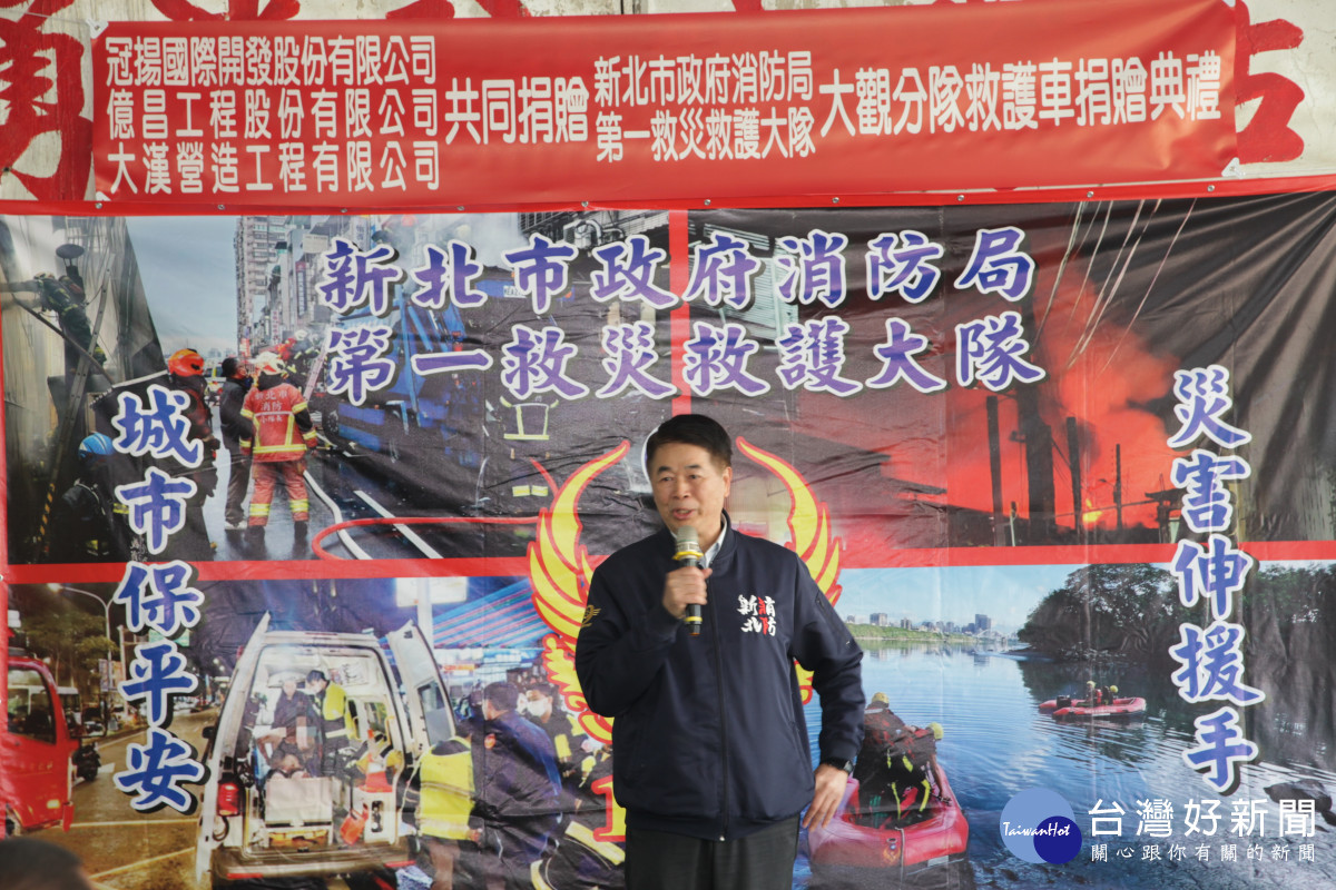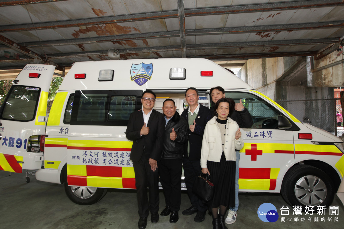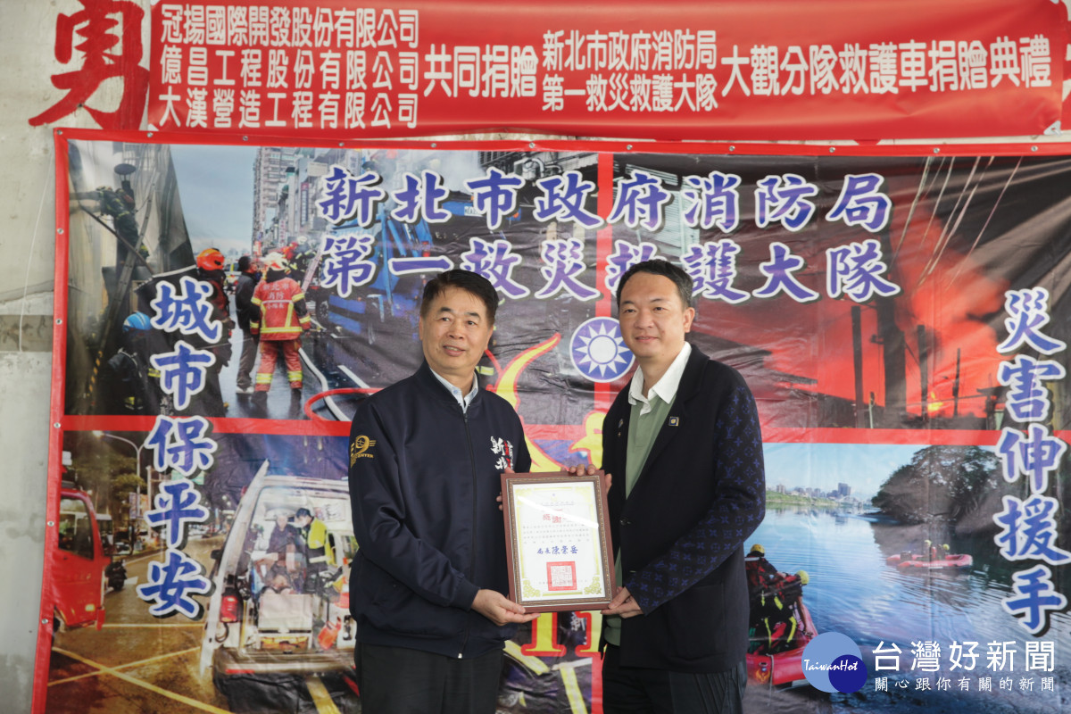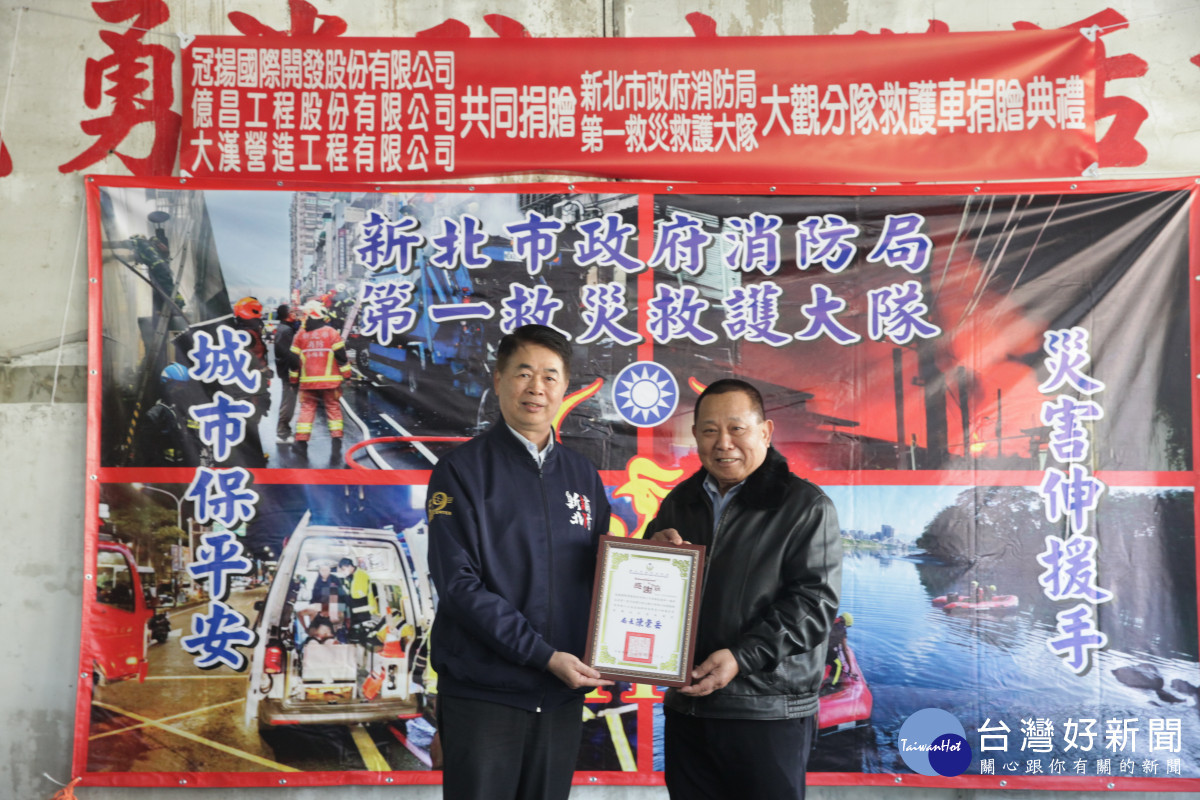 新北市政府消防局今( 13)日於大觀分隊舉行救護車捐贈儀式,冠揚國際執行長賴金龍與勝輝地產副董事長何易學共同捐贈「大觀91高頂救護車」,為第一線消防救護工作再添生力軍。消防局表示,將有效提升板橋地區緊急救護能量,為市民提供更即時、完善的生命守護。