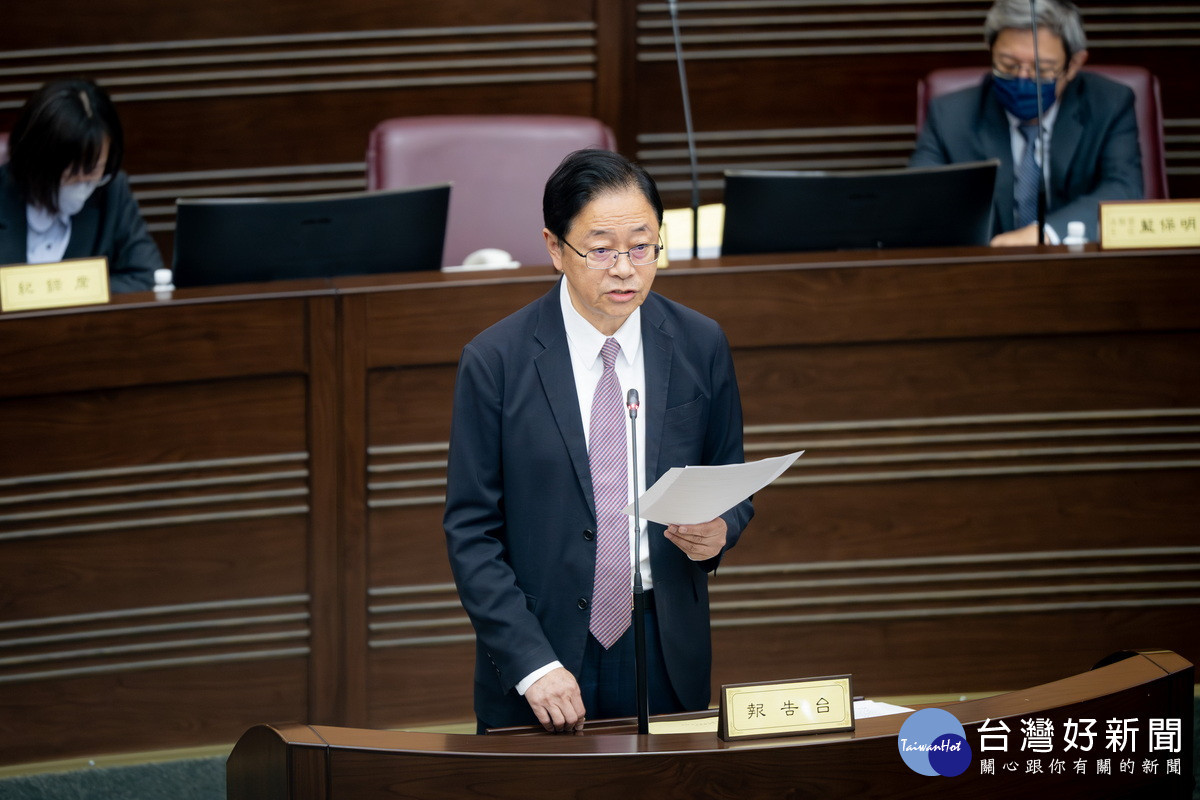 桃園市長善政於議事堂上接受議員質詢與說明。