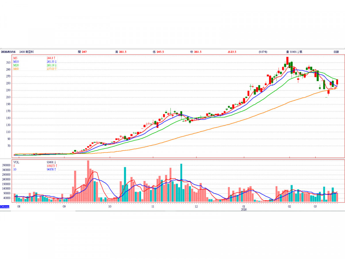 理周投研部表示,法人對南亞科2026年獲利預估具備極高想像空間,EPS 共識值落在 16 元至 33 元之間 。以目前外資最高目標價 400元與平均目標價322.5 元計算,仍具備一定的上漲空間 。雖然近期股價受台股震盪影響,單日波動劇烈出現「洗盤」現象,但在基本面動能充足且 P/B 值具備回升潛力的情況下,回檔至月線附近常吸引長期基金進場佈局 。