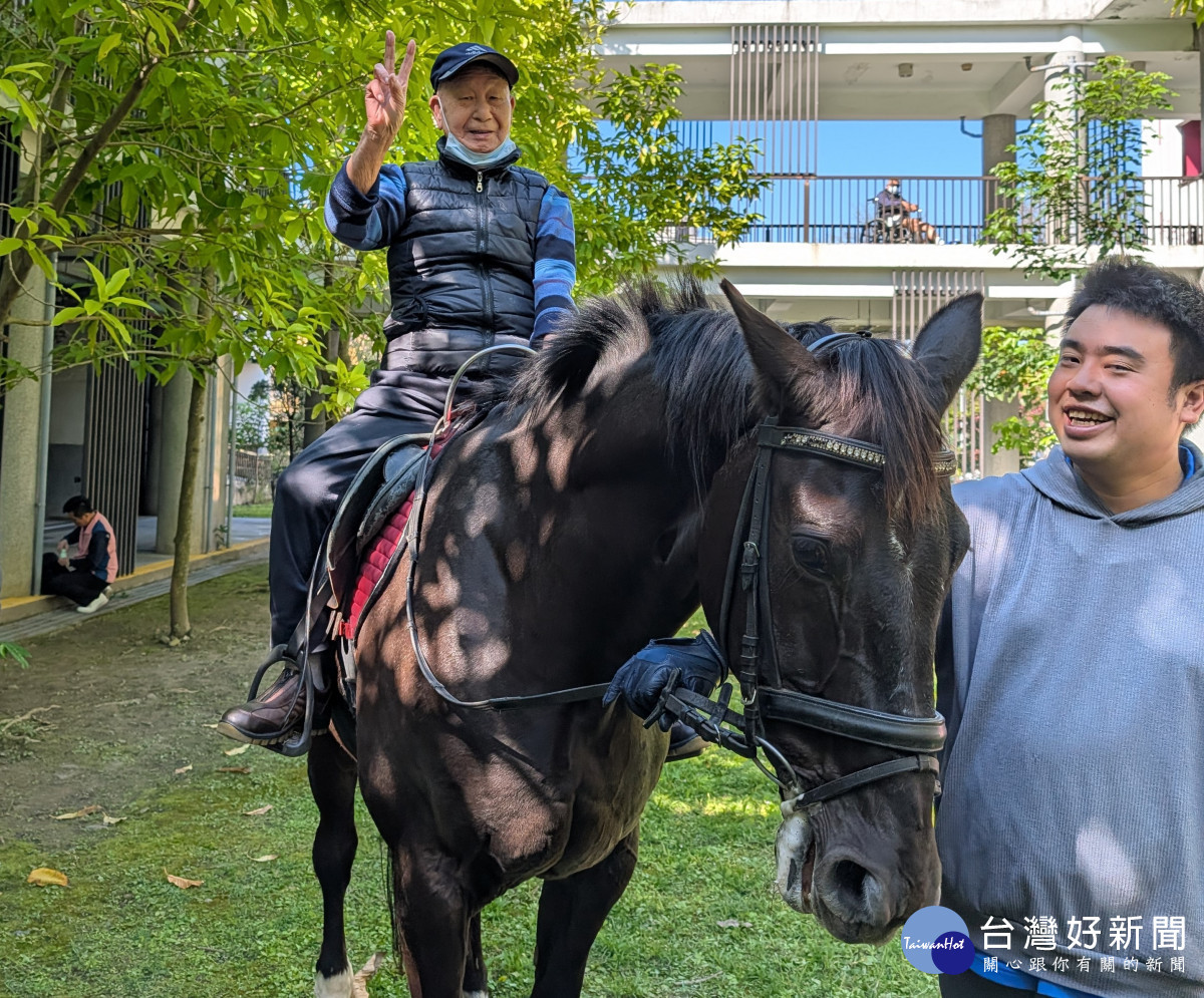 為療癒長輩身心靈並迎接馬年,板橋榮家特別舉辦「騎開得勝」活動,現場安排兩匹高大溫馴的馬兒走進榮家,邀請長輩與新北市智障者家長協會的「慢飛天使」共同體驗騎乘樂趣,在春意盎然的氛圍中,現場充滿喜悅,更象徵馬年一馬當先、萬事順遂。
