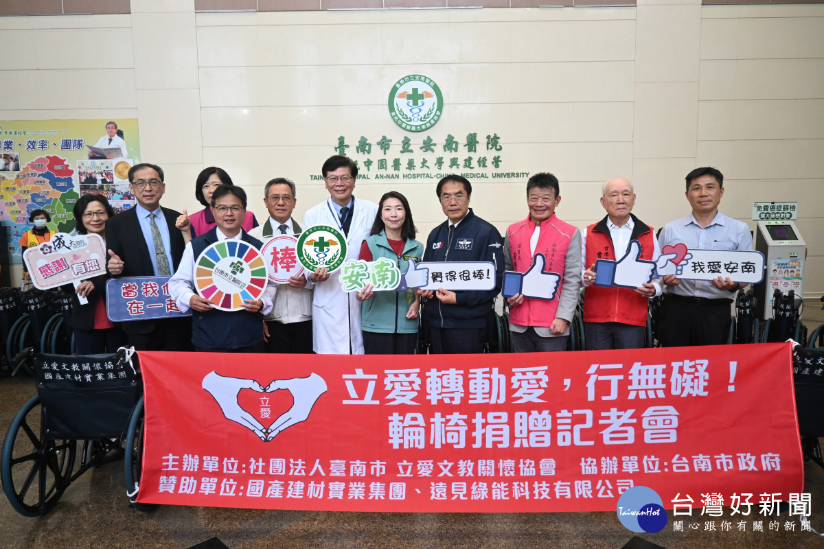 立愛文教關懷協會結合國產建材實業集團,捐贈130張輪椅予臺南市4家急救責任醫院,提升醫療院所服務能量並照顧行動不便民眾需求,18日上午於安南醫院醫療大樓1樓大廳舉行溫馨捐贈儀式。
