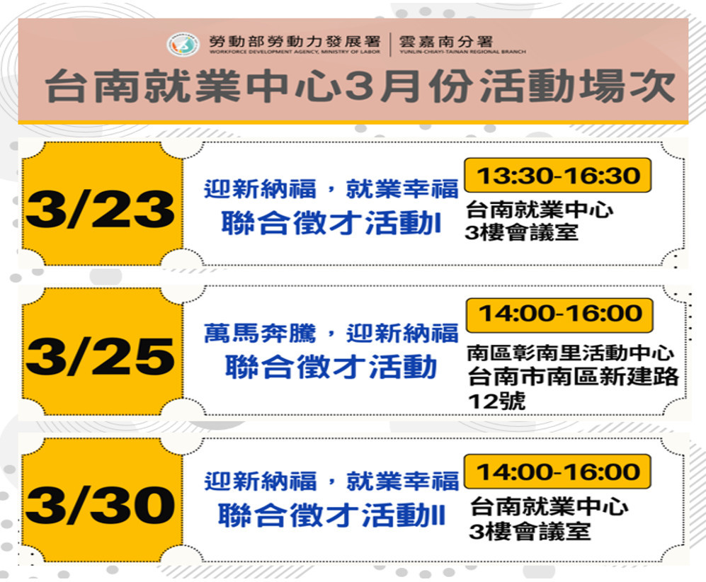 第3場於3月30日下午2時至4時回到台南就業中心3樓會議室舉辦,由統聯汽車客運、臺南紡織、漢來美食現場徵才;東信輕金屬、穎佳企業等代收履歷,提供大客車駕駛長、稽查人員、維修技師、化工工程師、廚房助理、儲備幹部、品管人員、倉管人員、計時人員等79個工作機會。