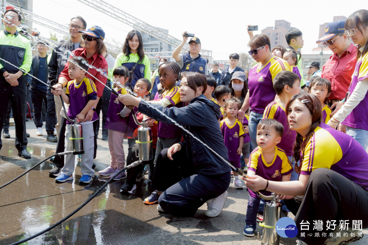 兒童節前夕,新竹市政府舉辦幼兒園消防體驗活動23日在樹林頭公園停車場超萌登場,2天2梯次活動預計共1,081位學童參與,實際體驗雲梯車搭乘、地震應變、射水救火、橫渡滑索等8項關卡,市長高虹安與現場孩童一起帶動唱開場,並共同體驗雲梯車升空救援滅火、橫渡滑索救援及帶領小朋友認識防災避難包。