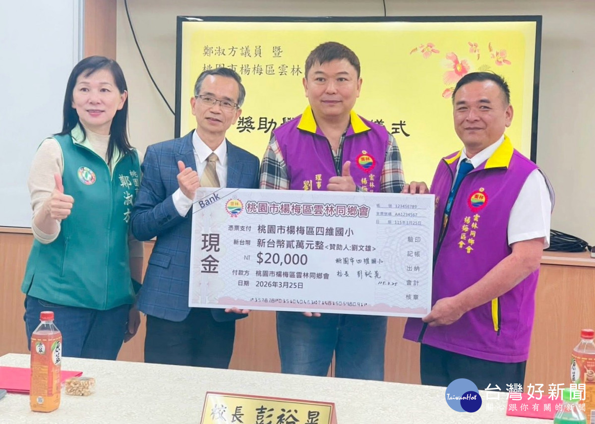 桃園市楊梅區雲林同鄉會25日由創會理事長邱孟毓帶領,前往四維國小捐贈新台幣 2 萬元獎助學金。出席人員包括現任市議員兼總顧問鄭淑方、副理事長李嘉裕、總幹事林得吉、財務長許美珠,以及本次捐贈人劉文雄理事(基甸汽車修配廠負責人)等熱心成員,由校長彭裕晃代表接受並回贈感謝狀。