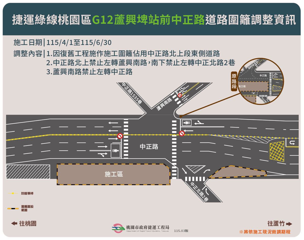 為配合桃園捷運綠線G12蘆興埤站前中正路道路復舊施工,自4月1日起於桃園區中正路進行第三階段復舊施工,本次施工圍籬將移設至中正路北上段東側道路,施工期間維持南下兩個車道北上三個車道通行,中正路北上禁止左轉蘆興南路,南下禁止左轉中正北路2巷,蘆興南路禁止左轉中正路,捷運工程局將落實交通維持佈設,提醒民眾行經本路段注意周邊交通動線的改變放慢車速小心駕駛。