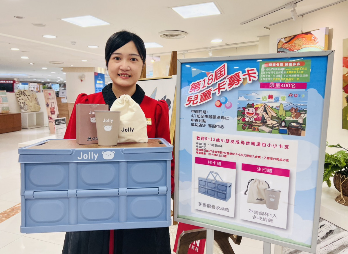 台南大遠百表示,有意申辦兒童卡的家長,可憑遠百APP會員、小朋友健保卡及120元入會費,到台南大遠百5樓客服中心辦理。除了上述專屬優惠,還可領取核卡禮、生日禮。今年的核卡禮是Jolly手提收納摺疊箱,生日當月再送Jolly不鏽鋼杯+收納袋,每月可免費報名1堂才藝教室課程。
