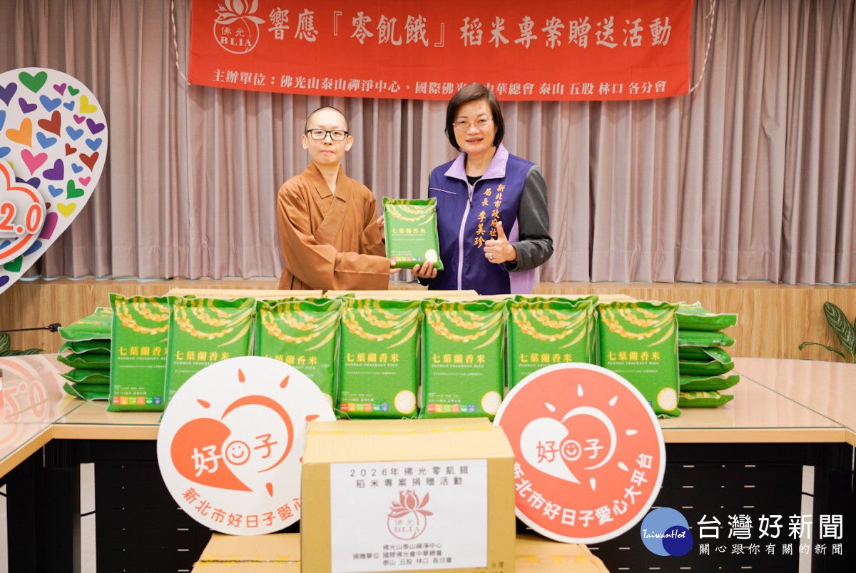 佛光山泰山禪淨中心響應新北市好日子愛心大平台,今(1)日捐贈1,866公斤白米,由新北市社會局長李美珍代表受贈,並回贈侯友宜市長感謝牌,這批滿載善念與祝福的愛心白米,後續將透過各社福中心發送予弱勢家庭,為家戶餐桌增添一份溫飽與安心。