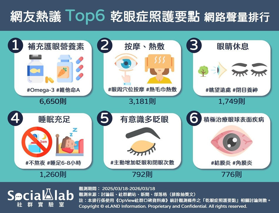 長時間盯著電腦與手機螢幕,您是否常感到眼睛乾澀、刺痛,甚至視線模糊?「乾眼症」已躍升為現代人最普遍的文明病之一。《Social Lab社群實驗室》本次透過《OpView社群口碑資料庫》,追蹤近一年關於「乾眼症照護要點」的網路聲量,整理出網友熱議的六大護眼對策,帶您從日常習慣找回水潤雙眼。