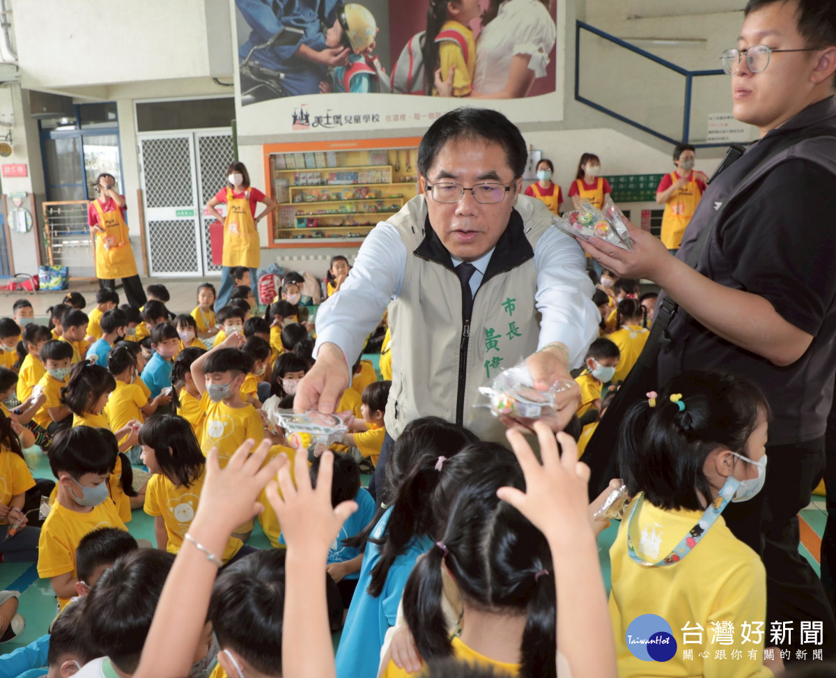 黃偉哲抵達幼兒園時,正好是晨間律動課程,他首先祝福300多位小朋友兒童節快樂及發送小禮物,並感謝園方及老師們。現場也有不少家長帶著孩子與市長合影留念,現場充滿歡樂氛圍。