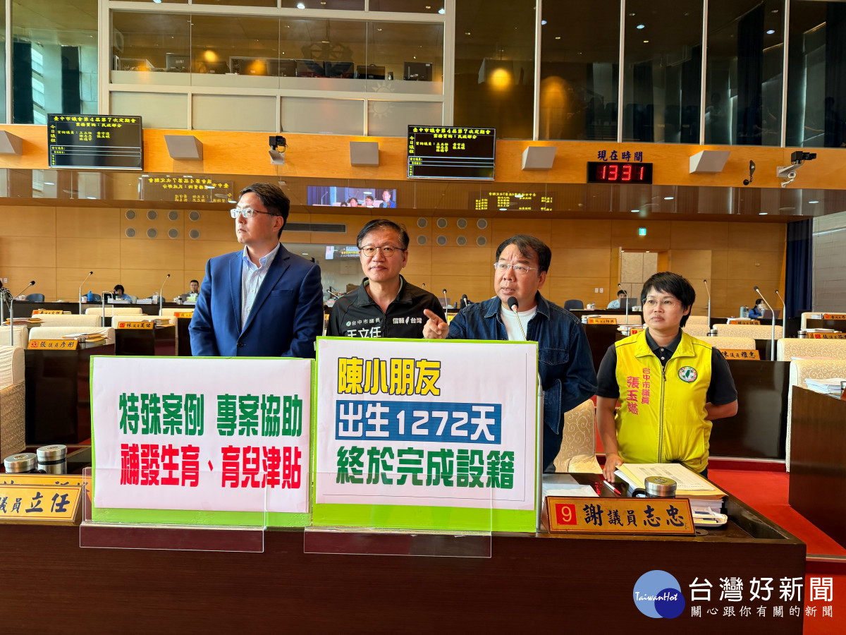 一名在台中出生的陳姓孩童因制度問題遲未完成設籍,變成「法院已認證的台中小孩,卻淪為戶籍孤兒」,經謝志忠議員協助提出質詢,歷經1272天才取得戶籍身分,陳姓小朋友終於在10日完成戶籍登記,正式成為台中市民。民進黨市議員謝志忠、張玉嬿等人13日再聯合質詢,要求市府啟動行政裁量機制,避免「戶籍孤兒」再現。社會局今日回應,將補發2萬元生育津貼,並協助爭取後續育兒津貼。