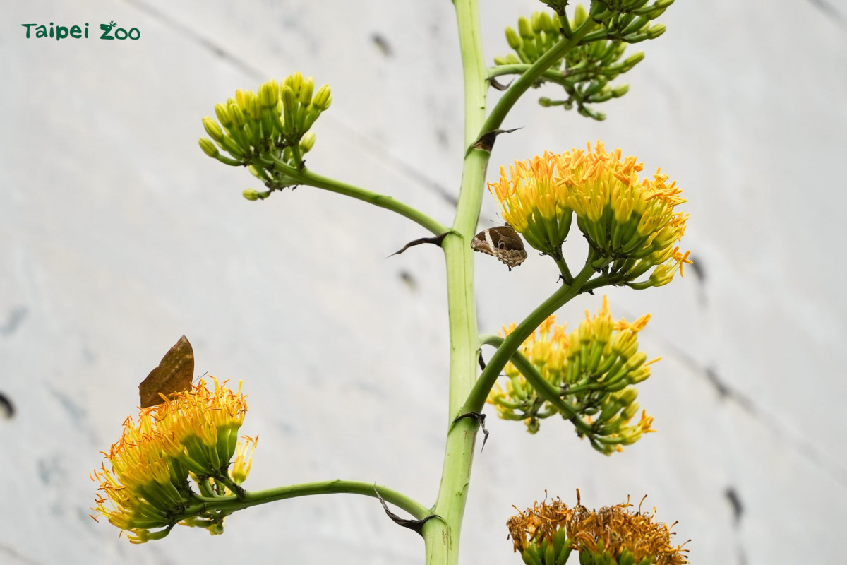 走到臺北市立動物園熱帶雨林室內館(穿山甲館 Pangolin Dome),除了近距離觀察棉頭絹猴、二趾樹獺、青鸞等蟲魚鳥獸,近期在館外周圍,有7株巨大的「龍舌蘭」(Agave)悄悄抽出了超過5公尺高挑的花莖,花朵正盛開。龍舌蘭最著名的特性便是「一生只開一次花」,在它們長達數十年的生命週期中,會不斷儲存養分,直到合適的時機,才會消耗全身的能量從葉叢內抽出一根巨大高直的花莖,在花莖旁則長出數株直徑約6至8公分的漏斗狀淡黃色成千上百的密集小花朵。在野外,這往往是吸引授粉者的關鍵時刻,天氣大好的時候都可以看到許多如蜜蜂、蝴蝶等昆蟲拜訪,甚至還有鳥兒停駐在枝間,等候「花朵餐盤」帶來的昆蟲饗宴。龍舌蘭的花期從初綻到凋謝大約只有數週,而在花朵凋零後,母株便會逐漸枯萎死亡,將所有養分傳遞給種子或側芽。