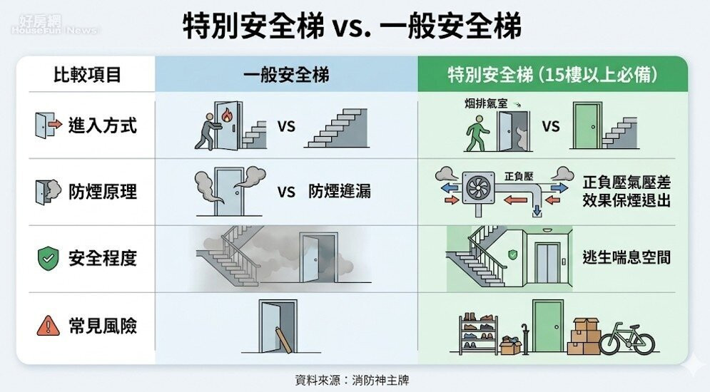買房時許多的建商、代銷多半是告訴你採光好、格局方正、CP值高,或是靠近學校、捷運等等,應該很少告訴你:高樓火災,死的人大多不是被困在房間裡,而是倒在逃生的路上!你可能會說,賣房子的人怎麼可能會講這些忌諱的事,身為第一線消防員的「消防神主牌」說,這一條逃生路線,很多人從來沒有走過,甚至不知道它在哪裡。根據法規,15 層樓以上大樓依法規必須設置「特別安全梯」,這並非一般樓梯,而是具備「排煙室」緩衝空間的專業逃生構造。 對於60歲以上的長輩與15歲以下的孩子來說,體力不足以支撐長距離奔跑,這間排煙室就是他們唯一的「喘息中繼站」。