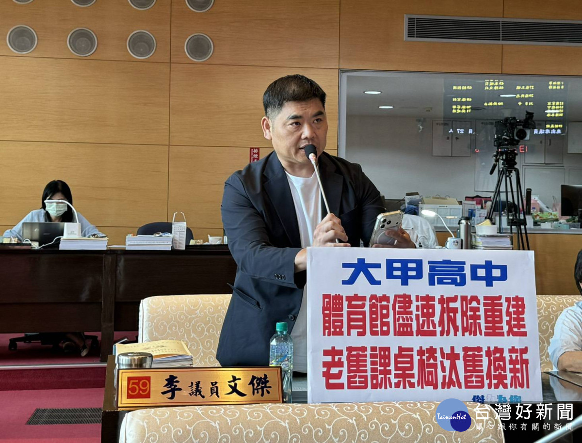 台中市議會定期大會教育文化業務質詢,市議員李文傑關切大甲高中體育館拆除重建進度及老舊課桌椅汰舊換新,也要求運動局盡快在大甲區興建大型運動場館,不能讓甲安埔成為唯一沒有綜合運動館的區域。