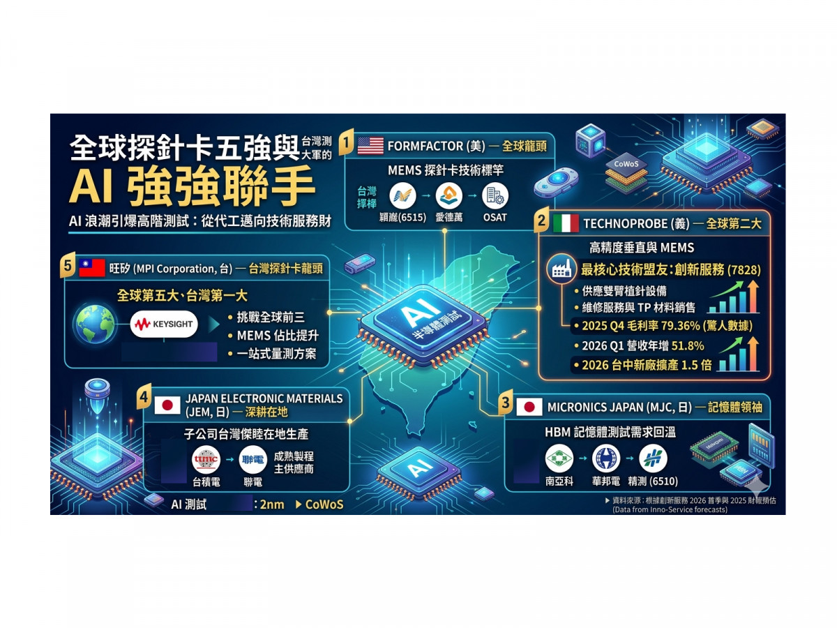 隨著 AI 晶片邁向 2 奈米尖端製程及 CoWoS 先進封裝,半導體測試介面的重要性日益凸顯。全球探針卡(Probe Card)市場目前由美、義、日、台五大巨頭割據,合計市佔率直逼七成。在這一波技術轉型中,台灣供應鏈不只是代工,更透過與全球巨頭的戰略結盟,展現出驚人的獲利能力與技術實力。