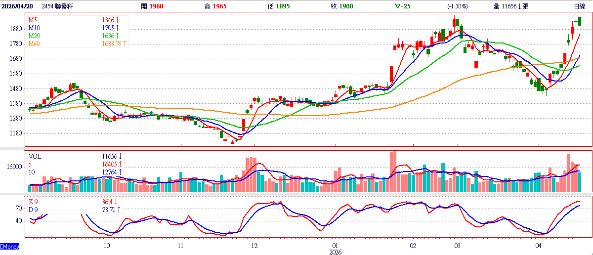 截至20日收盤,市場三大法人中,投信連5日買超共計3247張,外資、自營商及市場主力均反手轉為調節性賣超,賣超量分別為45張、29張及644張。聯發科股價於4月以來至21日收盤,共計上漲600元、漲幅達40.3%。
