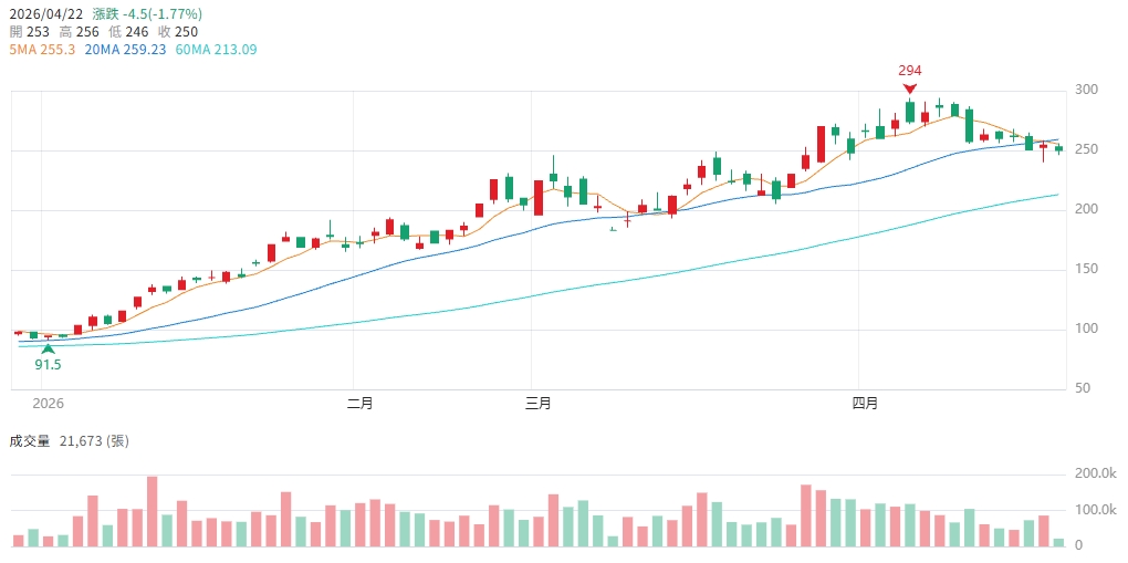 理周投研部表示,籌碼面4/21外資賣超1,610張、投信賣超1,637張、三大法人合計賣超2,544張,短線法人出現明顯分歧;拉長至2026年以來,外資累計賣超88,526張、投信買超33,088張,三大法人合計賣超59,324張,顯示外資持續高檔調節、投信積極承接的「大資金換手」結構。今日注意股標記代表監理單位也已示警,投機熱度升至高點、震盪幅度將進一步放大。技術面今日開高後迅速走弱,現價248元低於昨收254.5元及開盤253元,今日高點256元到低點246元之間空間有限卻已明顯破位;壓力依序在253元開盤(已轉壓力)、256元盤中高點、260元整數關卡;支撐在248元現價、246元今日低點,跌破246元將確認今日高檔轉弱訊號,屆時需回望240至238元一帶再尋支撐。