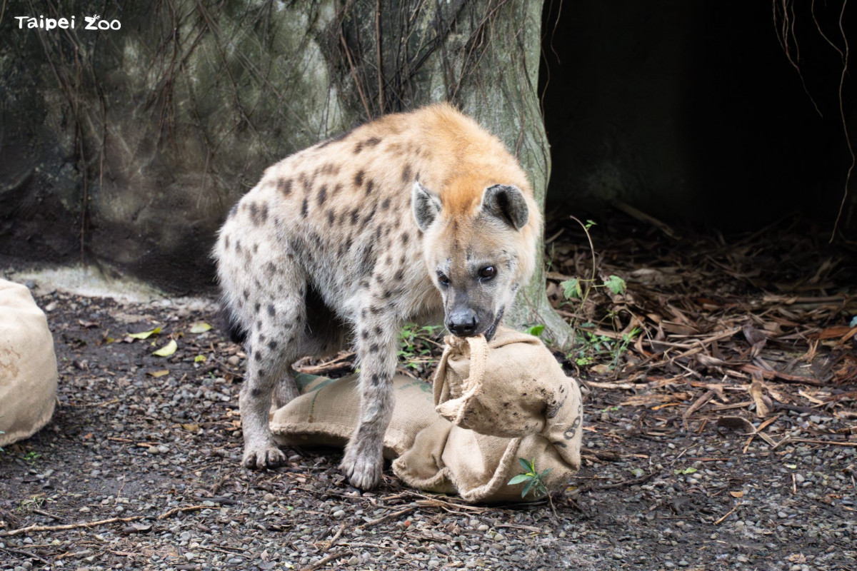 在斑點鬣狗的社會裡,「女力」當道,雌性個體不僅體型較大,地位也更高,這在肉食目動物中極為罕見。在臺北市立動物園的非洲動物區,可以觀察到斑點鬣狗雌雄互動既溫馨又逗趣的一面。保育員不定期會提供以麻布袋製作的行為豐富化「玩具」,沾上肉汁氣味或血水,讓斑點鬣狗發揮撲擊、啃咬物體的狩獵本能。兩隻斑點鬣狗中,雌性斑點鬣狗「小乖」較為強勢,經常會搶先探索行為豐富化物件並叼走獨佔,還驅趕好奇上前的雄性斑點鬣狗「小白」。因此斑點鬣狗「小白」只能趁對方「小乖」沒發現時,伺機找到麻布包偷偷嗅聞撕咬滿足一下好奇心。