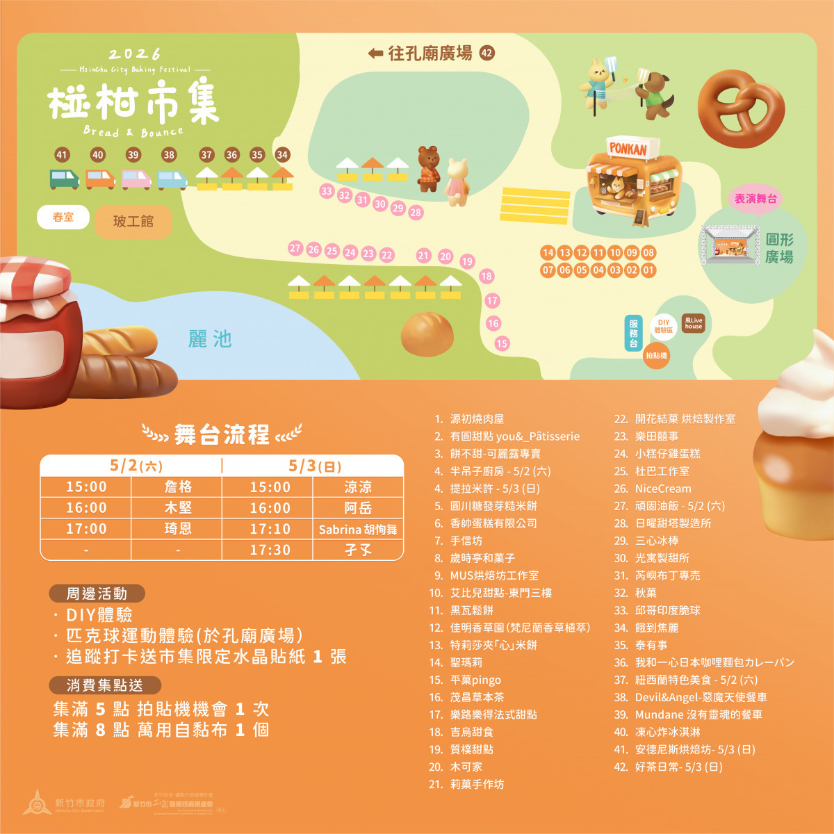 工商發展投資策進會總幹事曹永明表示,今年活動除延續歷年邀集新竹在地知名店家參與外,包含餅不甜、歲時亭及艾比兒甜點等人氣品牌,亦新增多家特色店家共同參與,如甜點實力備受肯定的源初燒肉。此外,活動亦規劃限定攤位,5月2日將推出國宴油飯品牌「頑固油飯」、雪球專門店「半吊子廚房」及新竹在地新興人氣店家「紐西蘭特色美食」;5月3日則邀請提拉米蘇名店「提拉米許」及由麵包名師吳克己經營的「安德尼斯麵包車」進駐,帶來多元且具話題性的美食選擇。同時,「Devil  Angel惡魔天使餐車」及「Mundane沒有靈魂的餐車」亦提供鹹食與創意料理,滿足不同族群需求。