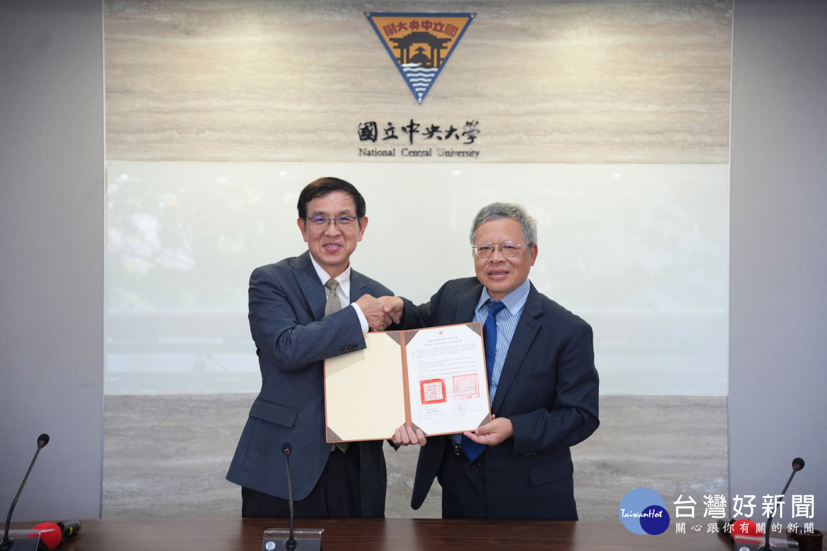 中央大學校長蕭述三(右)與國家圖書館代理館長翁誌聰(左)共同簽署合作,一同為歷史文獻活化而努力。