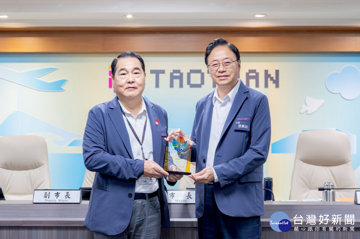 桃園市長張善政29日下午主持市政會議,接受水務局呈獻「打造永續放流水•節水減碳新農業」榮獲「2026智慧城市創新應用獎」肯定。張市長表示,市府推動民生污水淨化後再利用於農業灌溉,成功建立水資源循環利用與農業減碳兼具的創新模式,展現桃園在智慧治理與永續發展上的成果。