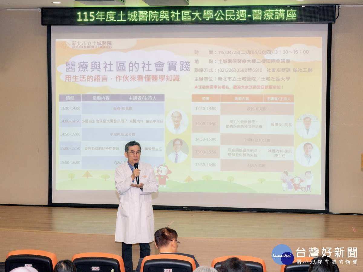 新北市立土城醫院攜手土城社區大學推「醫療與社區的社會實踐」系列講座,以淺顯易懂的方式傳遞醫學知識,協助民眾將健康觀念落實於日常生活,展現市立醫院推動公共健康、深化在地連結的具體實踐。