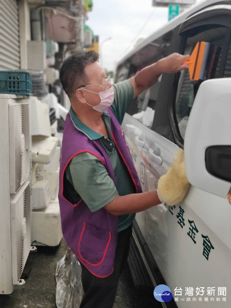 即使烈日下汗流浹背,仍然仔細完成車輛的清潔工作,鄭大哥希望透過自身的經驗,分享給更多窮苦朋友,只要肯做,就能為社會貢獻價值,為自己謀生。