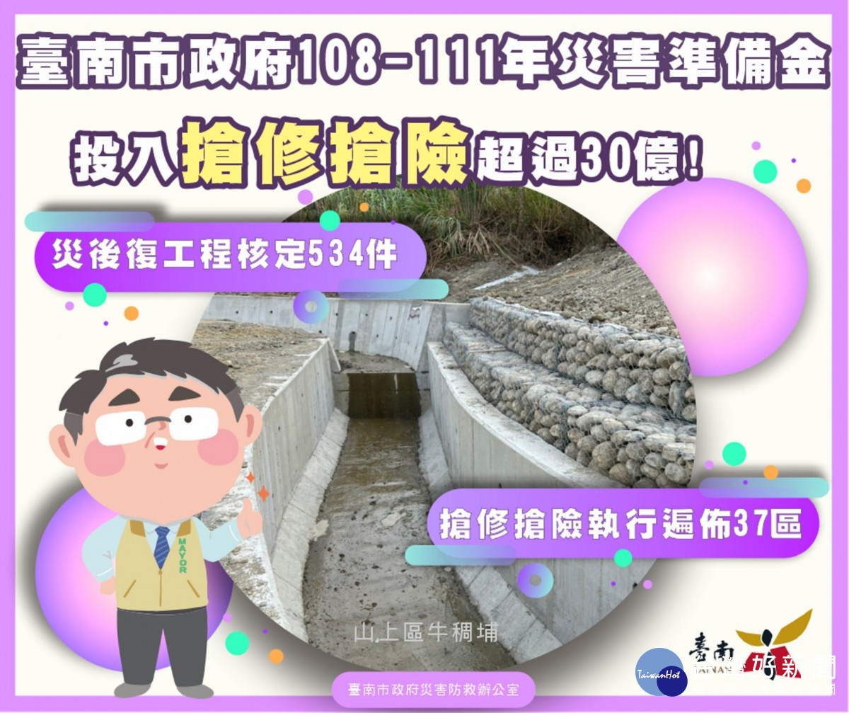 黃偉哲說,面對全球暖化造成的極端氣候,除了震災、旱災、輸電線路災害以外,短延時強降雨更是屢見不鮮,唯有居安思危,才能有備無患。因此上任以來,投入超過30億元積極推動安全無災大臺南,除了平時落實清淤疏濬、自主演習訓練及深耕防災意識宣導外,也非常重視災後復建工程,更想方設法兼顧工程品質與財政紀律,希望的就是能讓市民快速回復正常生活,從而發揮安定社會的功能,讓市民順心、放心更安心。