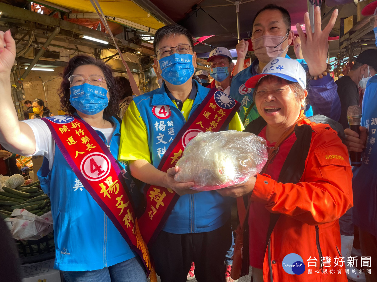 楊文科一早8點先到湖口顯聖宮參拜祈福,接著前往湖口市場,在國民黨籍縣議員候選人齊占翔等人的陪同下一起拜票,攤商熱情滿滿,不停握手為楊文科加油,除了送上蘿蔔寓意好彩頭,在地包子店老闆也送上包子,祝福楊文科高票當選,更高舉雙手表明自己是「鐵票!」,還有小朋友也特別跟縣長合照。