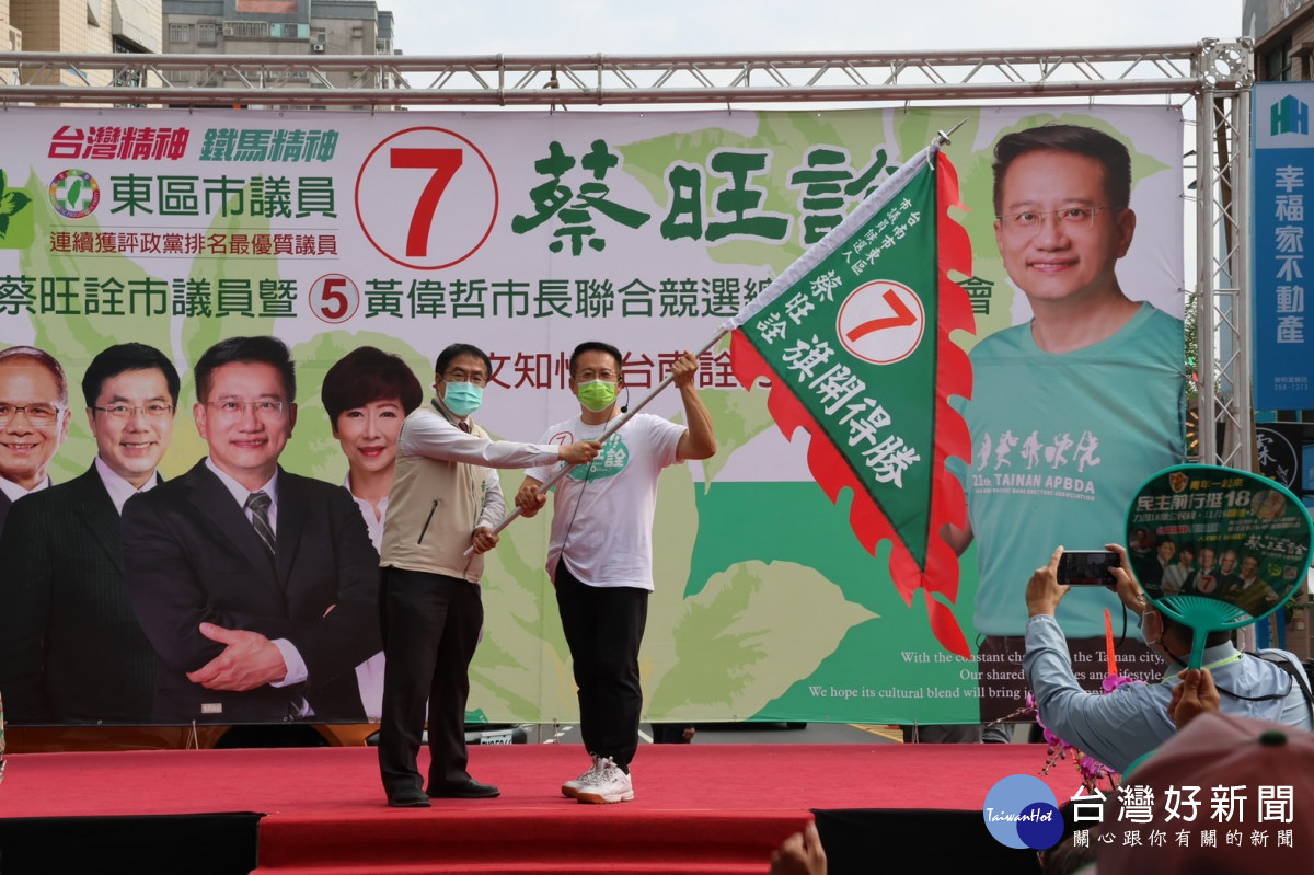 市議員蔡旺詮6日成立競選總部,也特別成立青年事務推動後援會顧問團。現場除同黨立委陳亭妃站台聲援,台南市長黃偉哲也為蔡旺詮「授旗」,立法院長游錫堃更南下表達支持,同框蔡旺詮高喊當選。