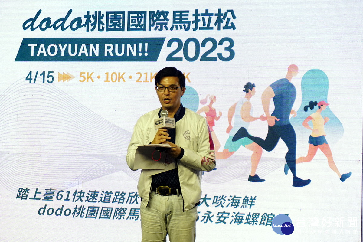 由桃園市政府與渡簬企業股份有限公司攜手共同舉辦的「2023 dodo桃園國際馬拉松」,將於4月15日於桃園新屋海螺文化體驗園區開跑,9日舉行賽前記者會,市府體育局長許彥輝偕同協辦單位、活動代言人「桃園璞園領航猿」藍球隊球星張鎮衙、盧峻翔及樂天女孩,一同歡迎全國愛好馬拉松的跑友們,把握報名機會踴躍參賽。