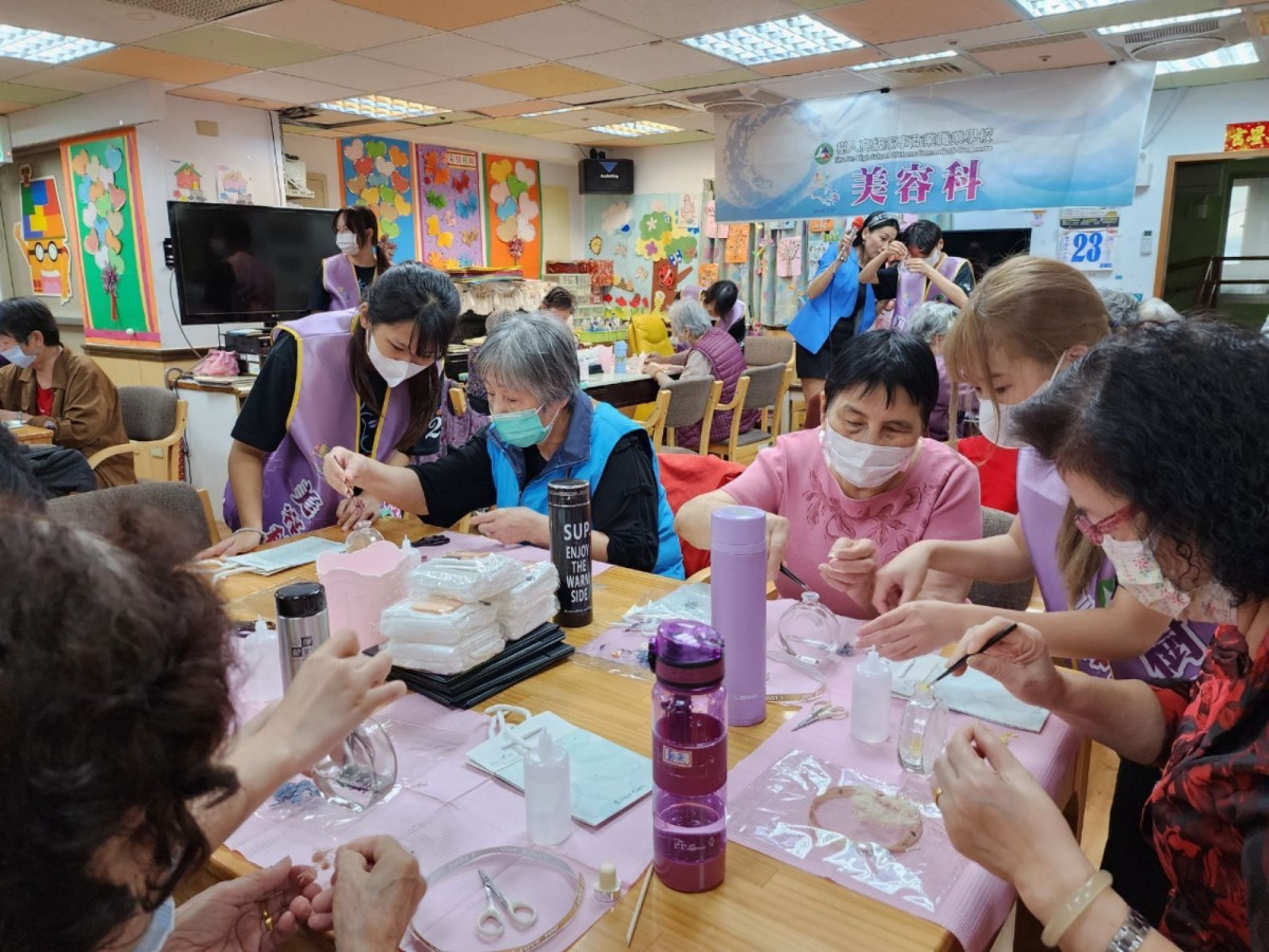 樹人家商透過新北創新教育加速器計畫以「安心新北、扶老同行、樂活人生」為目標,近日樹人家商美容科師生們攜手資生堂前往新莊愛活樂園社區長照機構,與長者一同製作DIY療癒浮油花並協助長者進行基礎保養彩妝;結合手工藝美學與化妝療法帶給長者一場身心療癒之旅,從而加深了產學、社區照護機構共融的情感聯繫,提高社區的凝聚力。