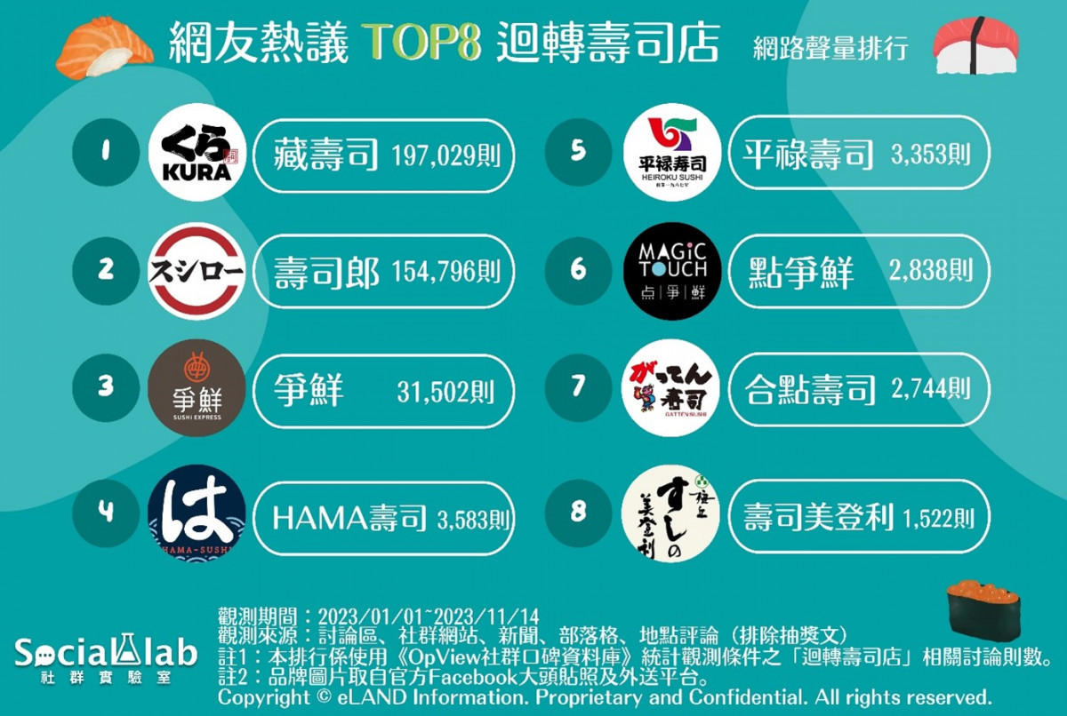 《Social Lab社群實驗室》本次透過《OpView社群口碑資料庫》追蹤近一年內「迴轉壽司店」相關話題的網路聲量,帶您了解網友熱議的迴轉壽司店排行。