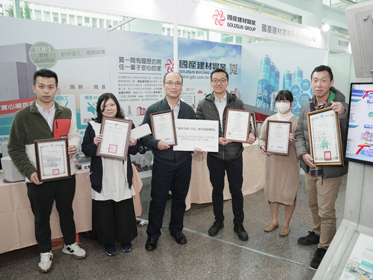 國產建材研發中心副總、國宇建材總經理楊志強(左3)表示,國產建材近年往優質的全建材集團邁進,投入與時俱進的ESG,研發上積極布局碳競爭力與綠色設計,繼率先混凝土產業,全集團獲得英國BSI的碳盤查國際認證之後,碳礦化混凝土也獲得CETES新材料新工法驗證,並成立可執行國家級檢驗能力的TAF實驗室,展現與世界接軌的碳競爭力。
