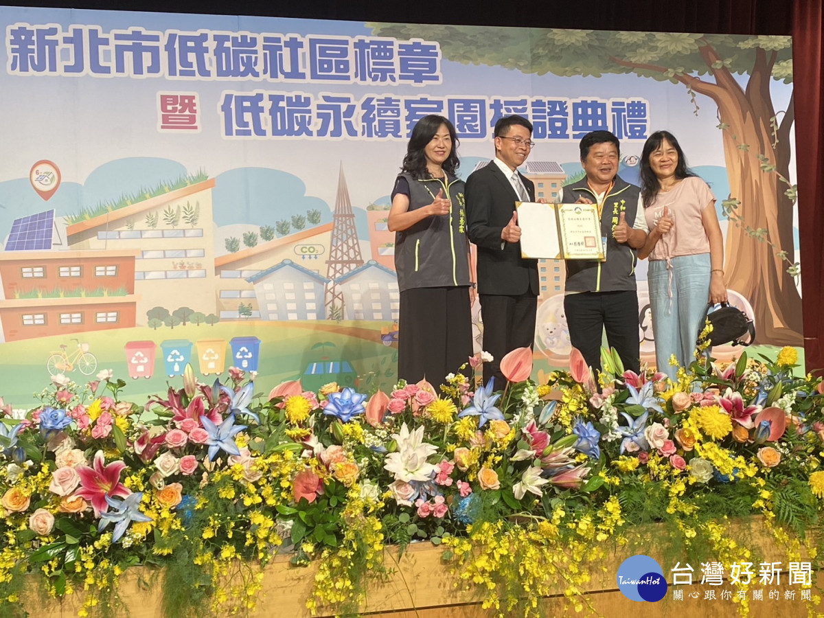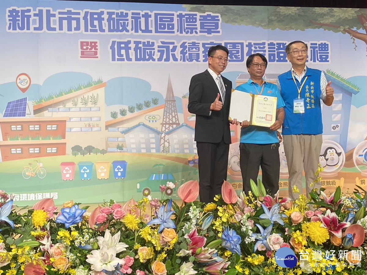 新北市環保局今(11)日於市府大禮堂舉辦「低碳社區標章暨低碳永續家園授證典禮」,共有1個行政區及15個里獲環境部低碳永續家園認證,52個社區獲得新北市低碳標章認證,環保局長程大維親自頒發證書,感謝各單位在邁向淨零的路上與環保局同行,也期待未來持續發揮創意並發揮影響力,讓更多單位願意參與低碳改造工作,共創永續家園。
