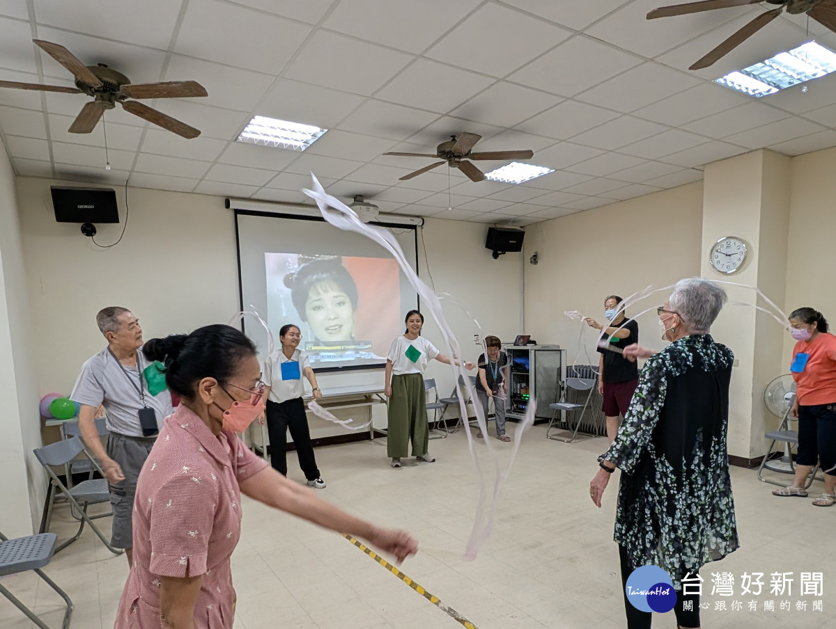 師生與長輩們在熟悉的「鳳陽花鼓」音樂中透過手搖鈴一起擺動身體,長輩們更倆倆合作,由氣球來感受兩人互動中引導者及協調者的角色轉換,有趣的是,雖然長輩擔任的是協調者,但在氣球互動上卻是明顯的引導者,可見其夫妻間之互動模式,最後更透過學生親手製作的彩帶進行律動活動,長輩們一起舞動彩帶,像是跟自己身體每個部位跳舞。