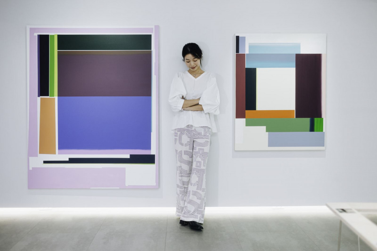 展覽中的繪畫多為大尺幅,色塊間以不同比例佈局,畫面沒有明顯的中心,無邊、延展、閃爍。這些色面與空隙的安排,是一種「隨機編輯」,讓每位觀眾看到的節奏都不一樣。有趣的是,當你移動腳步、變換觀看角度時,畫面也似乎隨之流動起來,讓人忍不住停下腳步、重新「對焦」自己感知的方式。
