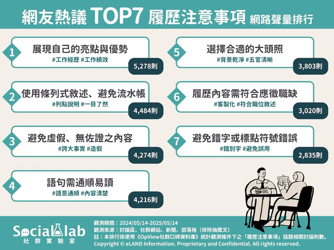 《Social Lab社群實驗室》本次透過《OpView社群口碑資料庫》追蹤近一年「履歷注意事項」話題的網路聲量表現,帶您了解網友熱議的7大履歷撰寫注意事項。