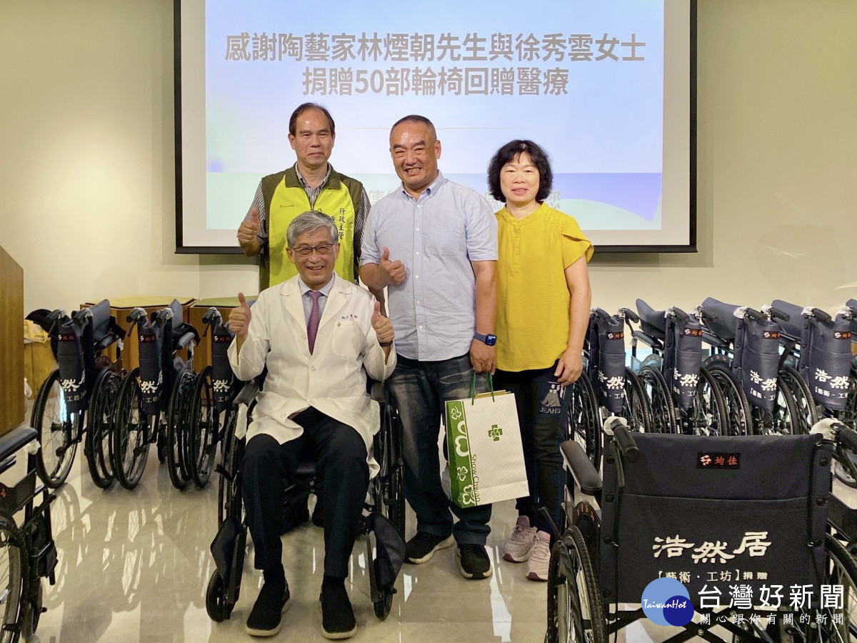 陶藝家林煙朝感念秀傳貼心服務,捐贈50部輪椅回饋醫院。圖/秀傳醫院提供