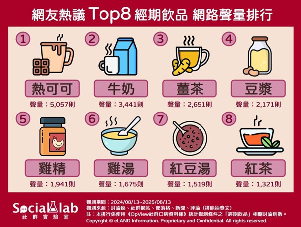 生理期來臨時,身體的不適感常讓人們更注重飲食選擇。《Social Lab社群實驗室》透過《OpView社群口碑資料庫》追蹤近一年的討論,發現「熱可可」穩居網友熱議的經期飲品冠軍。